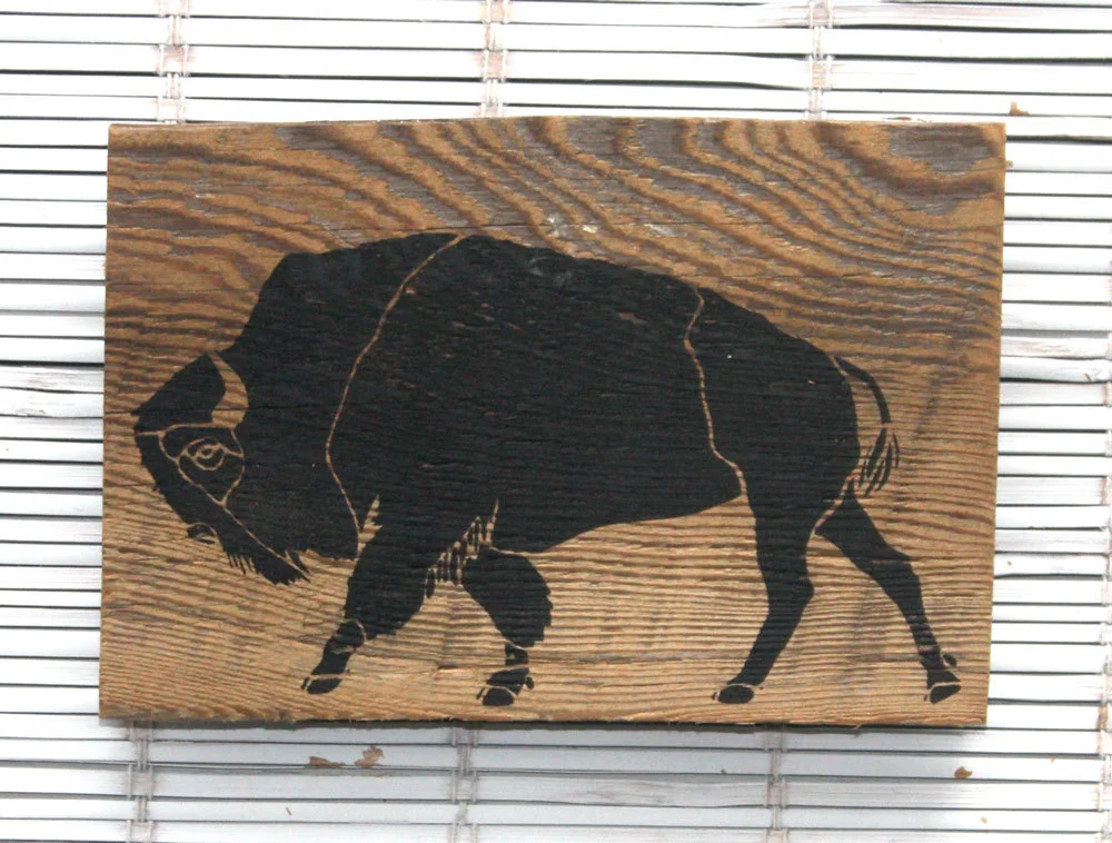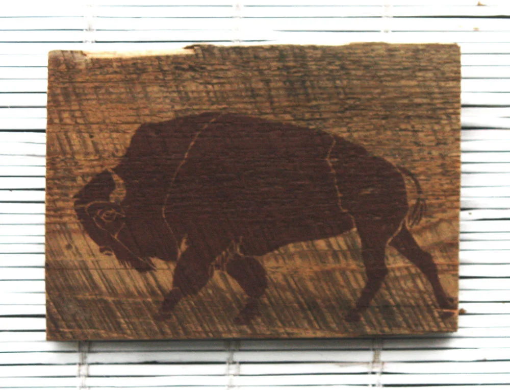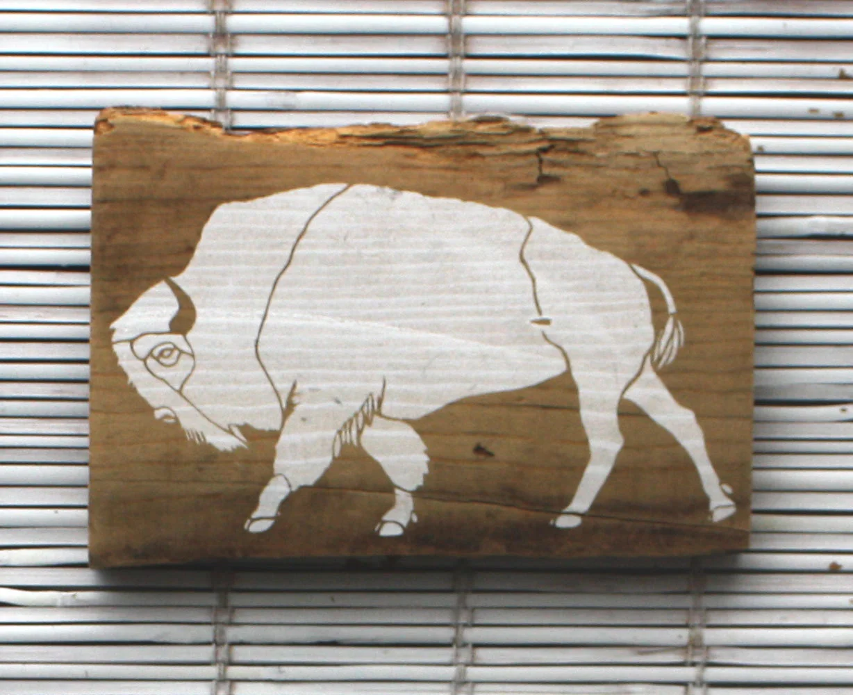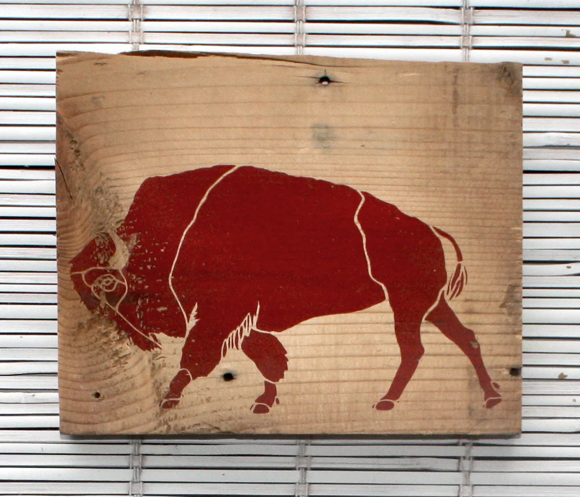 BISON SCREEN PRINTED IN GREY INK ONTO RECLAIMED BARN WOOD SIDING.