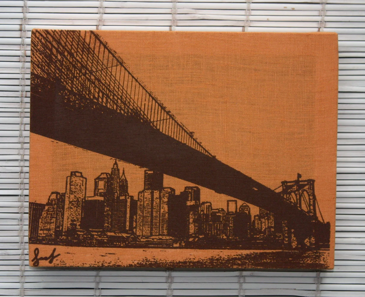 SKYLINE OF NEW YORK CITY HIGHLIGHTING THE BROOKLYN BRIDGE AND LOWER MANHATTAN. ARTWORK BASED ON ORIGINAL PHOTOGRAPH TAKEN AT EMPIRE-FULTON FERRY PARK IN BROOKLYN.