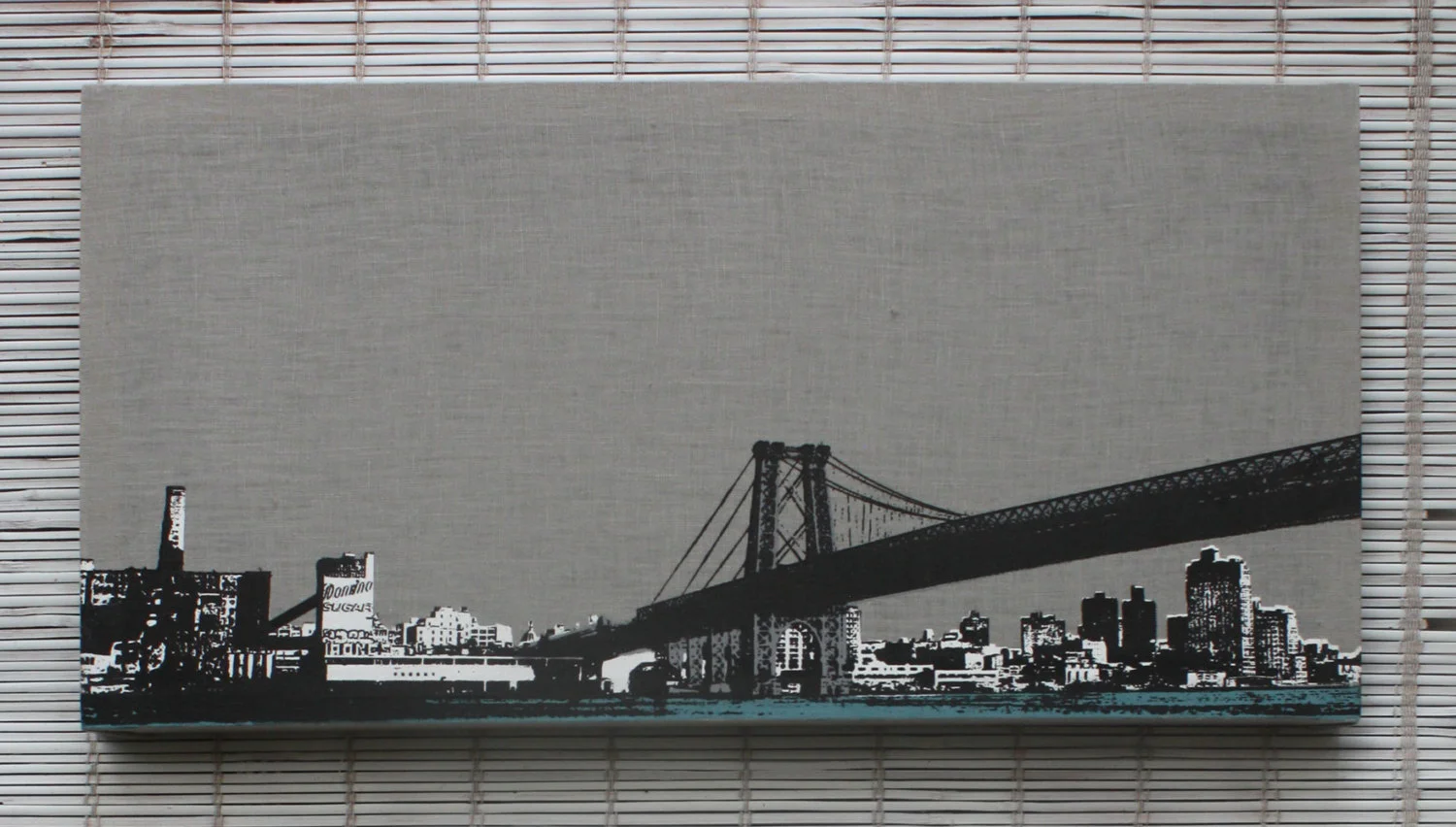 ARTWORK IS BASED ON AN ORIGINAL PHOTOGRAPH TAKEN ACROSS THE EAST RIVER FROM LOWER MANHATTAN.