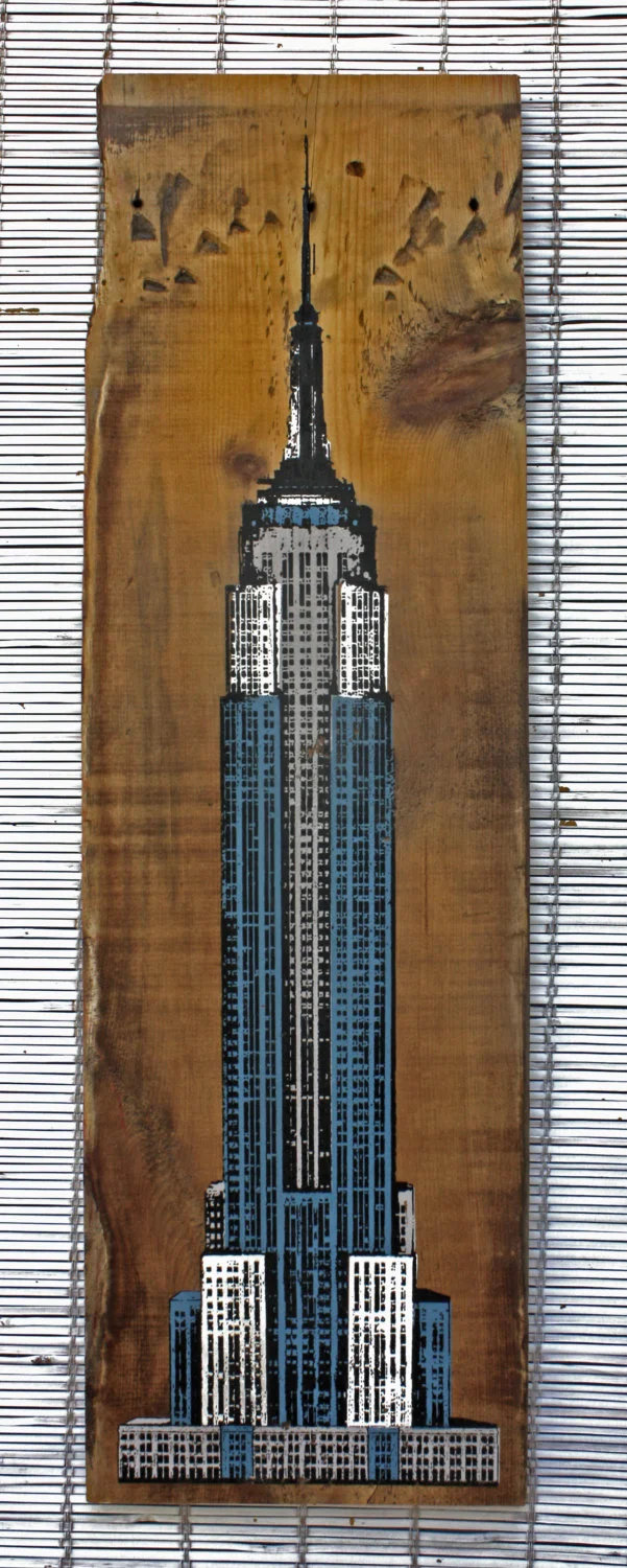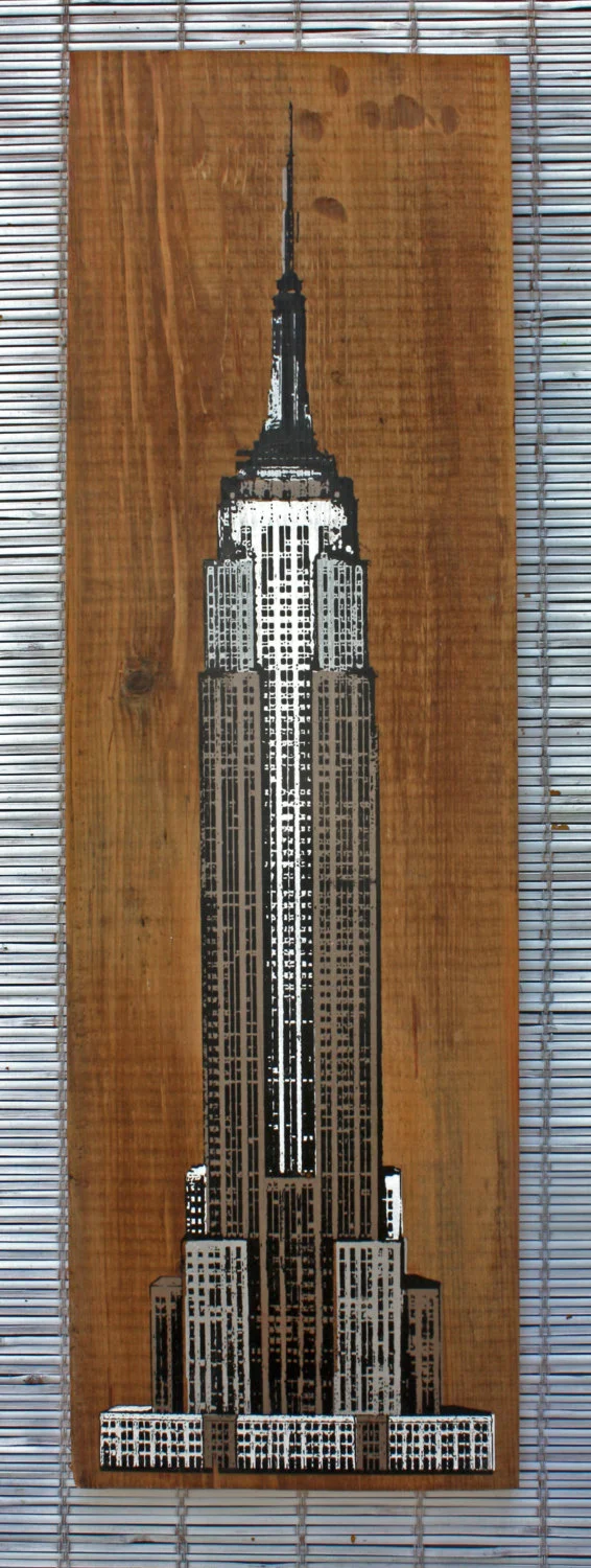 NEW YORK'S FAMOUS EMPIRE STATE BUILDING IS SCREEN PRINTED BY HAND ONTO RECLAIMED BARN WOOD SIDING.