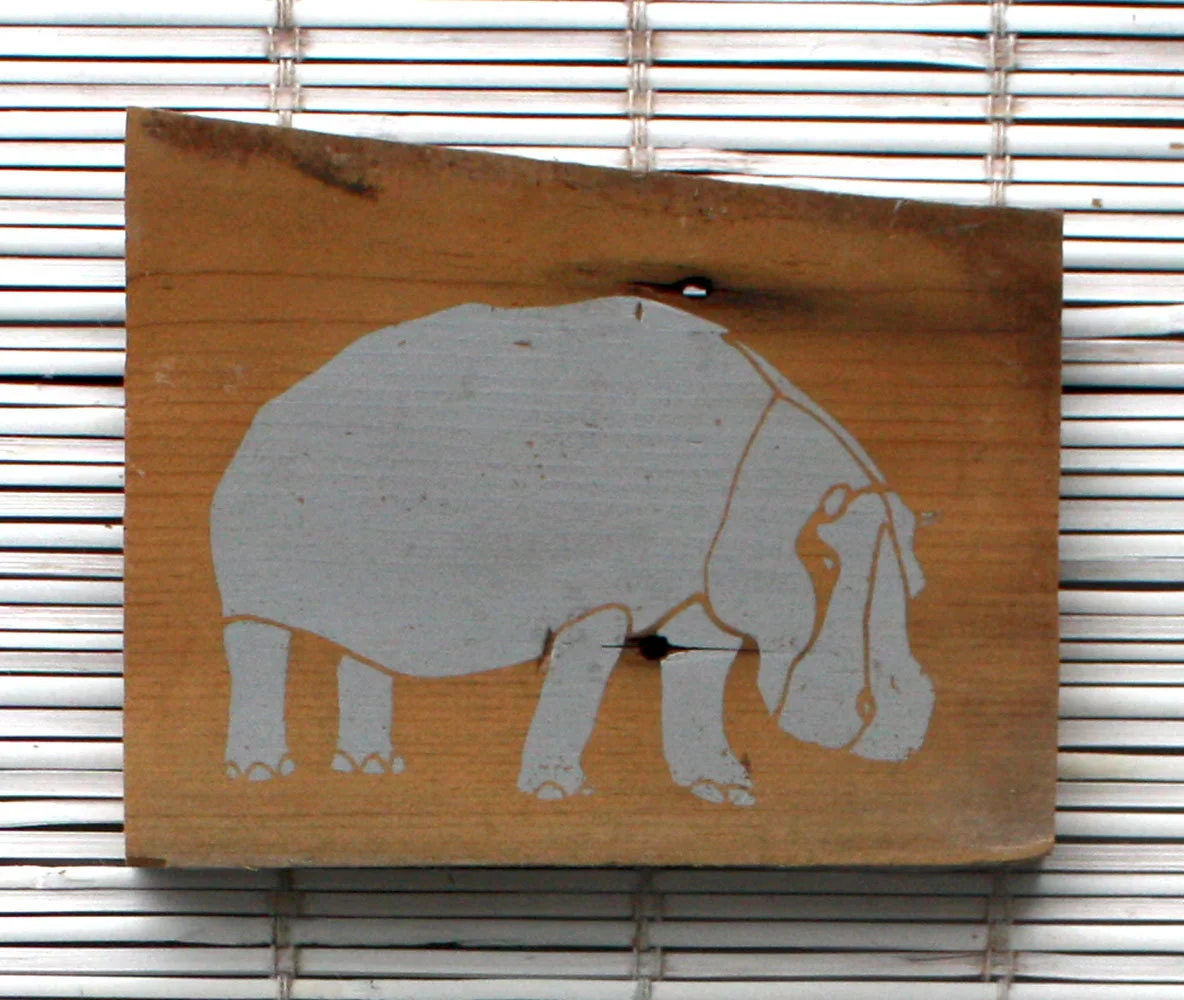 HIPPO SCREEN PRINTED IN PINK INK ONTO RECLAIMED BARN WOOD SIDING.