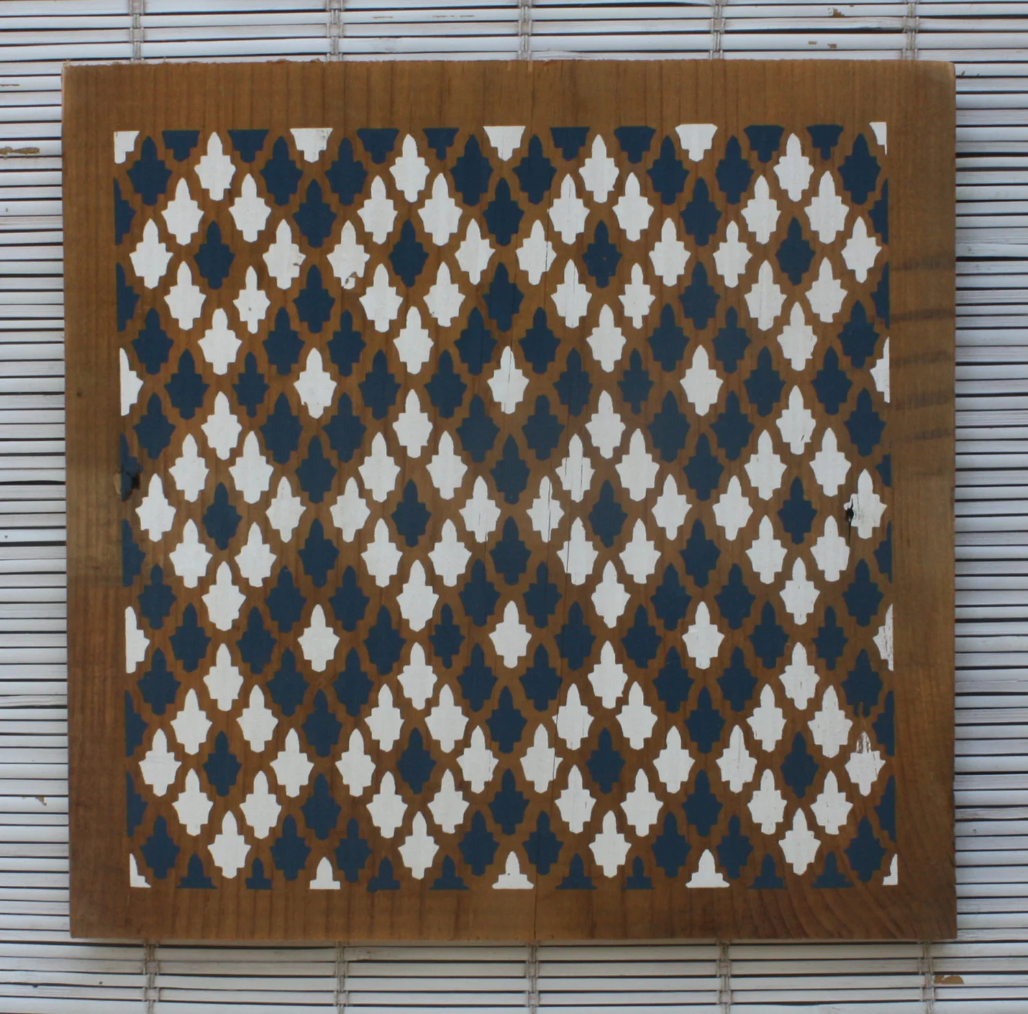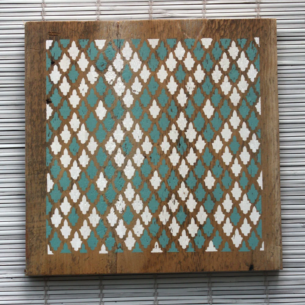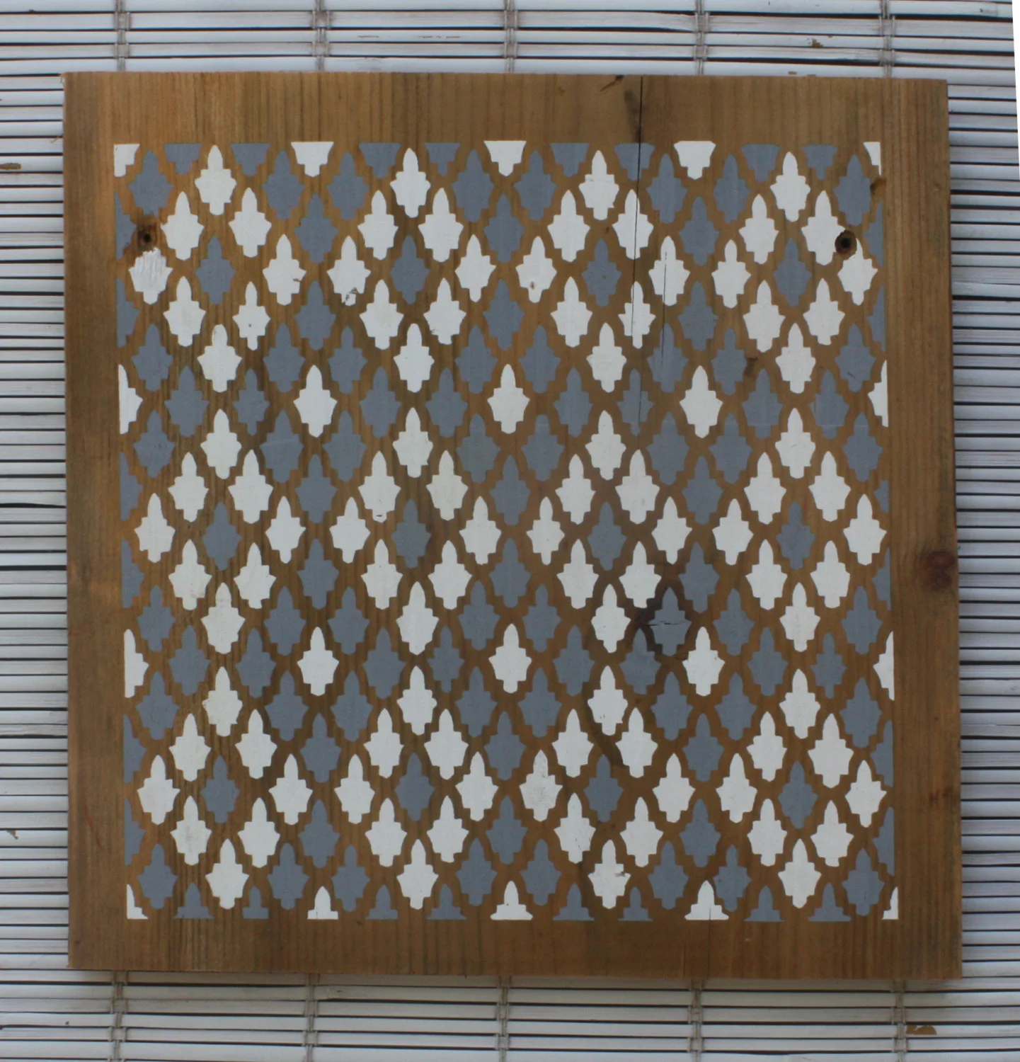 MOROCCAN TILES PATTERN SCREEN PRINTED BY HAND ONTO RECLAIMED BARN WOOD SIDING.
