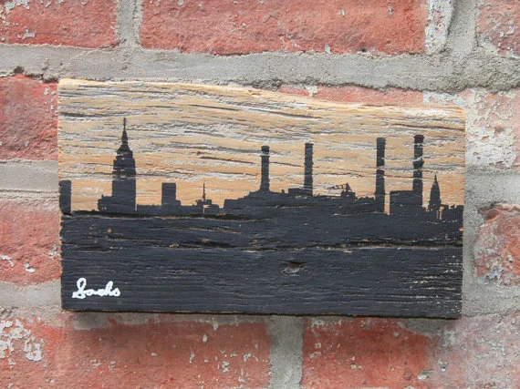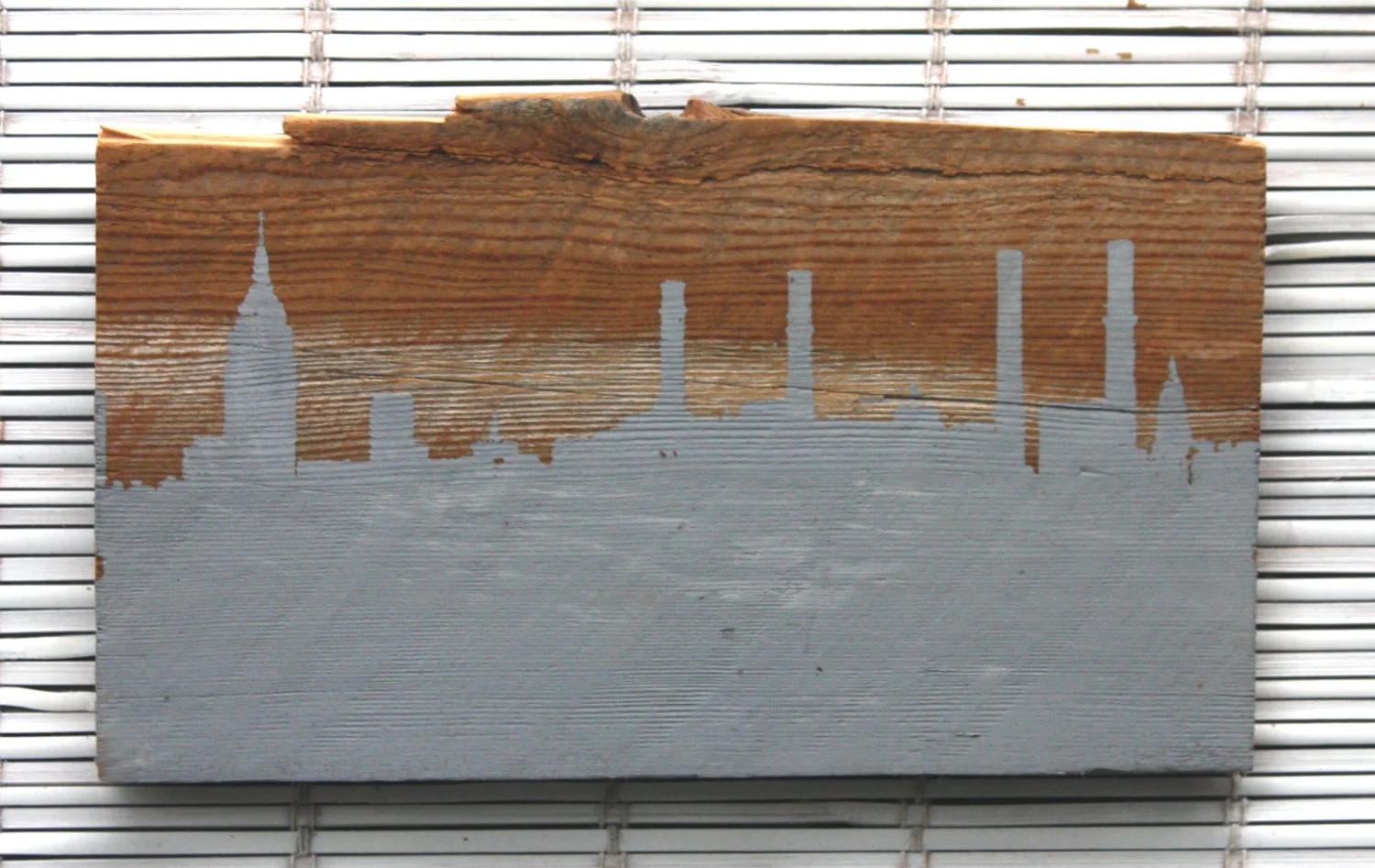 SCREEN PRINTED BY HAND IN BROWN INK ONTO RECLAIMED BARN WOOD SIDING.