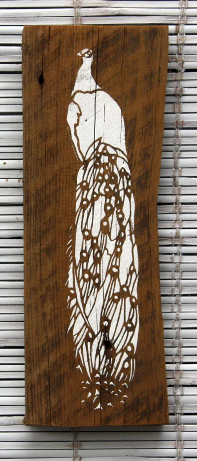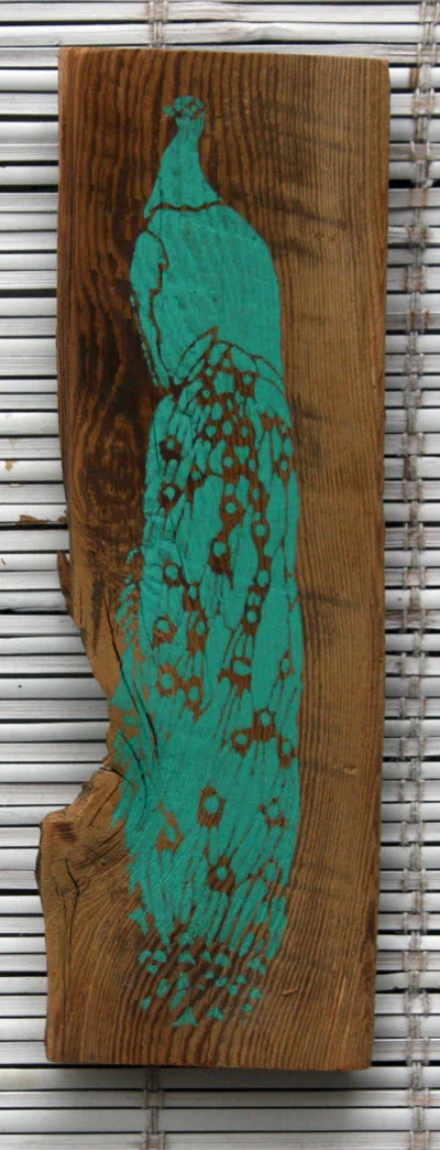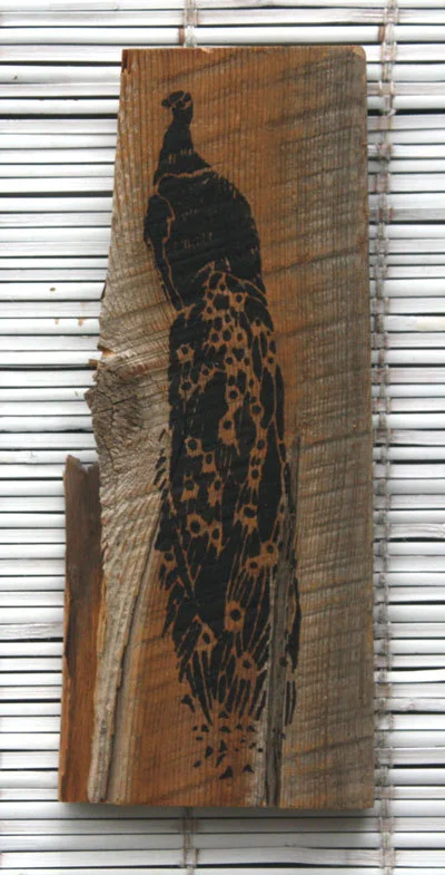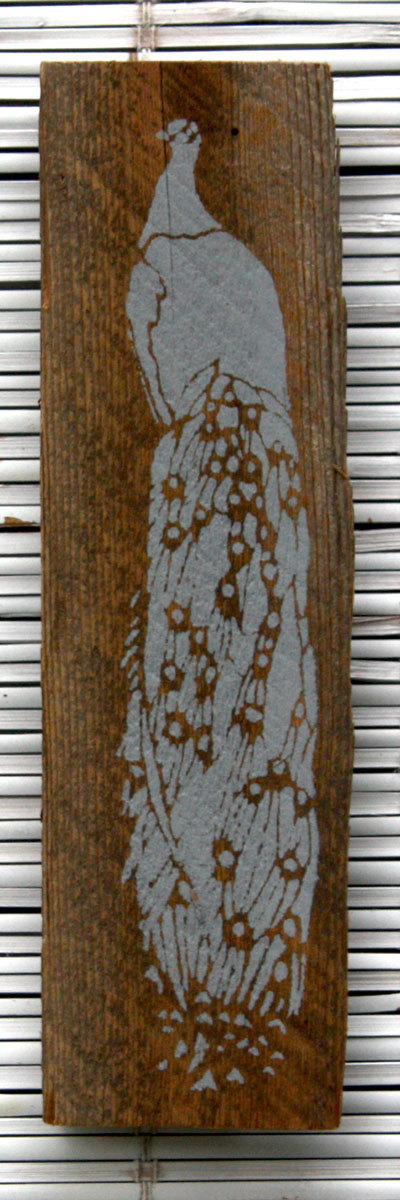 PEACOCK SCREEN PRINTED IN MULTICOLORED INKS ONTO RECLAIMED BARN WOOD SIDING.