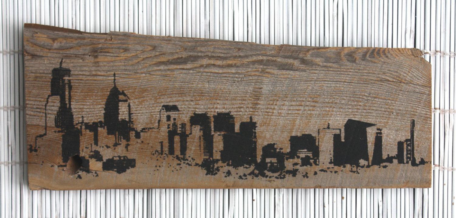 SKYLINE OF PHILADELPHIA SCREEN PRINTED BY HAND IN WHITE INK ONTO RECLAIMED BARN WOOD SIDING.