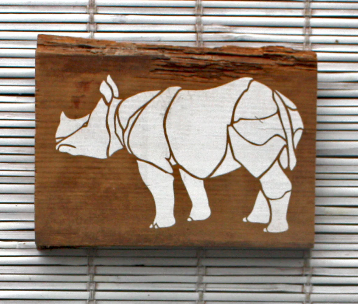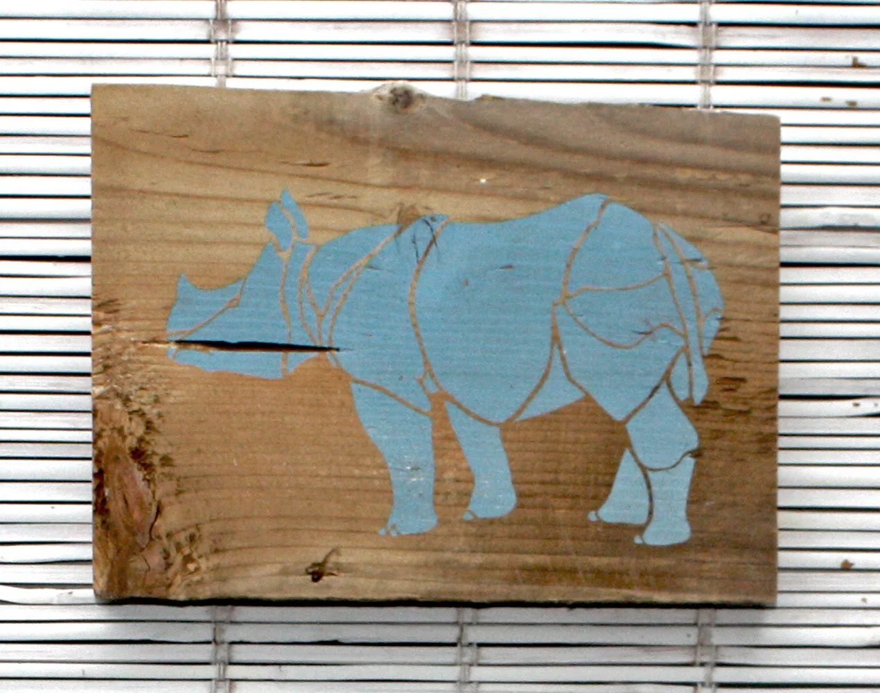 RHINO SCREEN PRINTED IN GREY INK ONTO RECLAIMED BARN WOOD SIDING.