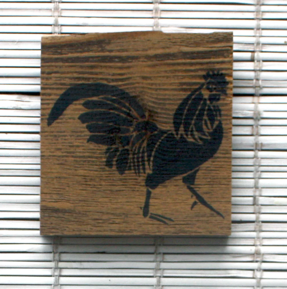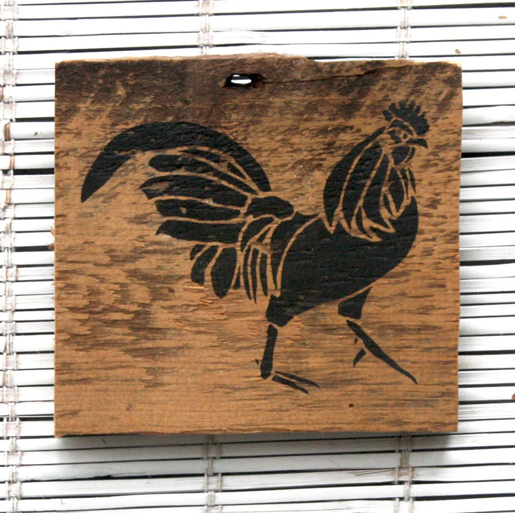 ROOSTER SCREEN PRINTED IN WHITE INK ONTO RECLAIMED BARN WOOD SIDING.