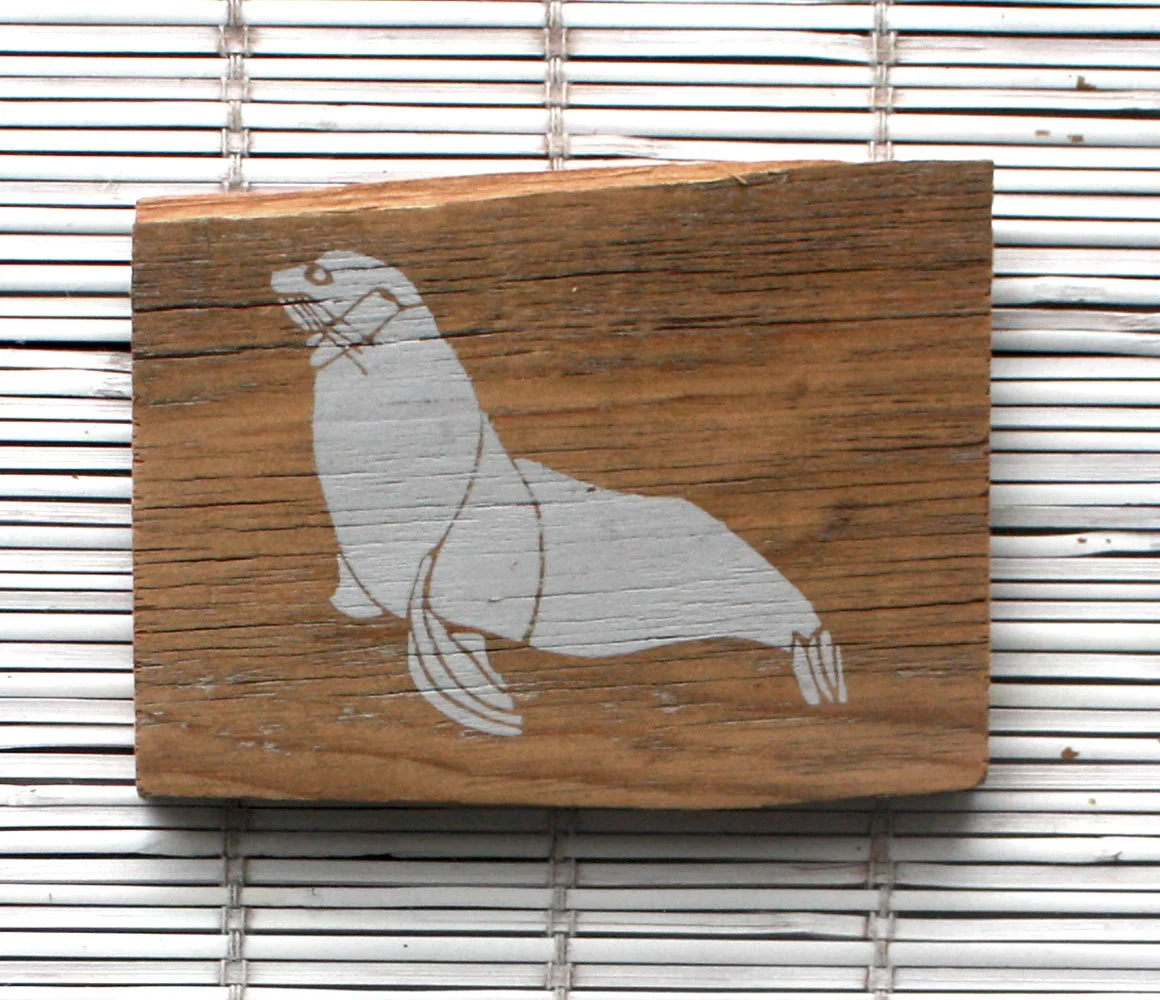 SEAL SCREEN PRINTED IN BLACK INK ONTO RECLAIMED BARN WOOD SIDING.