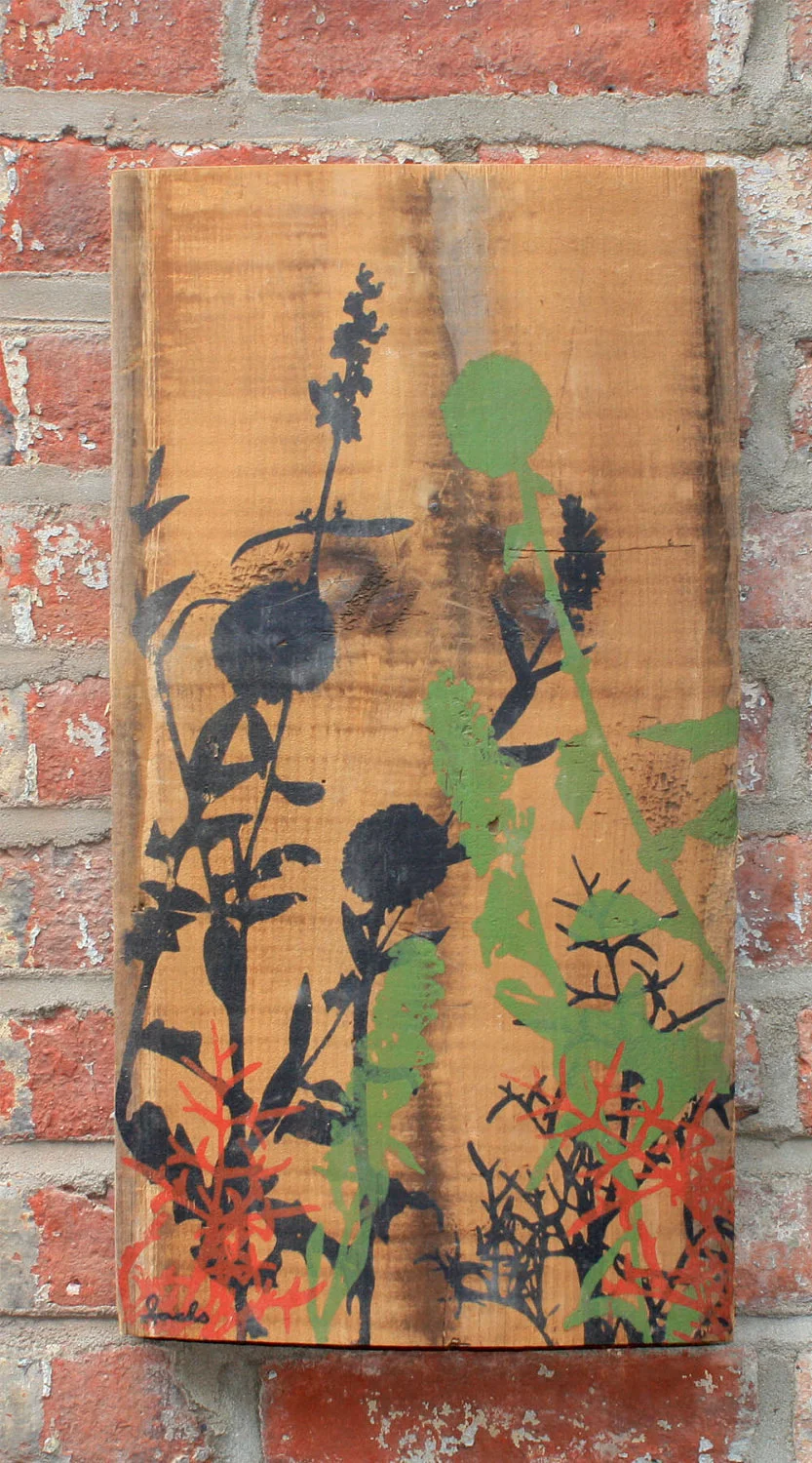 THISTLE PRINT IN AQUA, BROWN, AND WHITE INKS ON RECLAIMED BARN WOOD SIDING.
